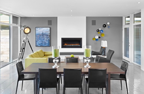 リビングとダイニングがひとつながりになった間取りのリビング空間とダイニング空間の間の壁面にシルバーのインダストリアルスポットライトを置いた例。
