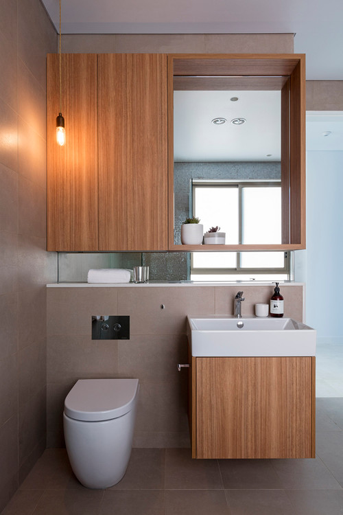 洗面所の壁際に、縦長のエジソンランプを吊り下げた例。