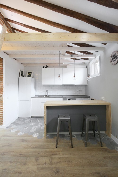 グレーのコード&ソケットの先端に、まん丸のエジソンランプを取り付け、等間隔で3灯吊り下げたカウンターキッチンの例。