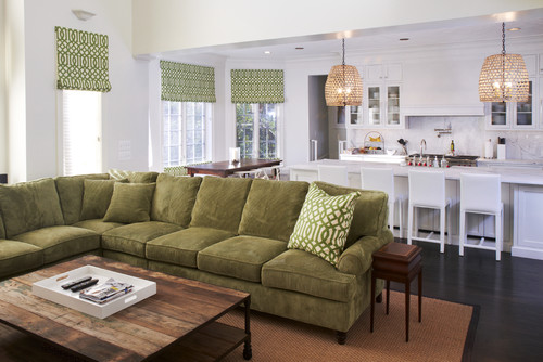 インテリア雑誌や家具のカタログには、黄緑のソファとベージュ系のラグを組み合わせた自然を感じるコーディネート例がよく掲載されていますが、緑のソファを使ったインテリアはこれだけではありません。