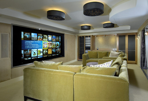 薄いグリーンのソファと明るいピンクの無地のラグをコーディネートした地下室の例。