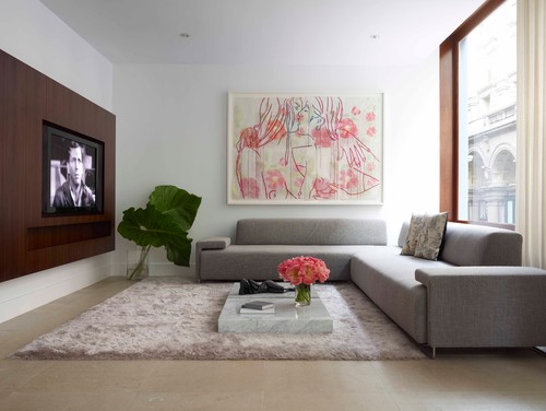 ライトグレーのコーナーソファを置いたモダンなリビングの壁面にピンクでカップルと花を描いた抽象的なアートを飾った例。
