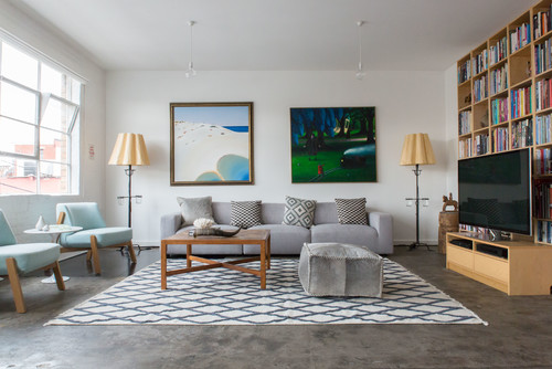 コンクリート床のリビングに、グレーのファブリック製コーナーソファ・ライトグレーのラグ・黒天板+木脚の円形テーブルをコーディネートした例。