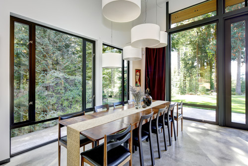 コンクリート床のダイニングに、艶のある茶色の木製長方形ダイニングテーブルと黒レザー&木製フレームのチェアをコーディネートした例。