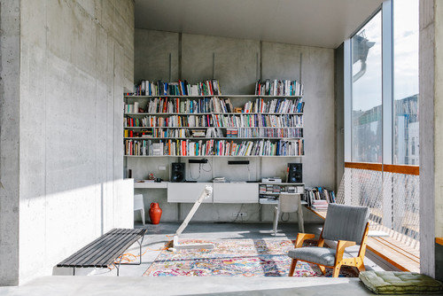 本が100冊以上収納してあるゴチャっとした本棚もコンクリートの冷たさの影響で、さほど乱雑に見えない不思議…。