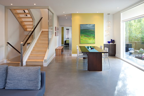 コンクリート床のリビングダイニングのダイニング側に、明るい茶色の木製テーブル&チェア、リビング側にライトグレーのソファをコーディネートした例。