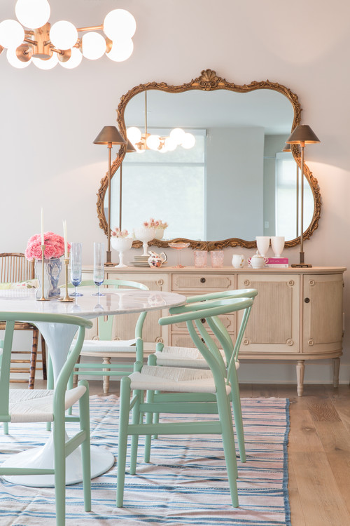 ゴールドのシャンデリアとミラーをコーディネートしたダイニングに、ホワイトのテーブルと薄いグリーンの木製チェアを置いた例。