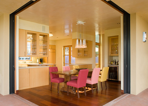 リビングとの境界線側のチェアを背もたれ無しにした、開放的なレイアウト。