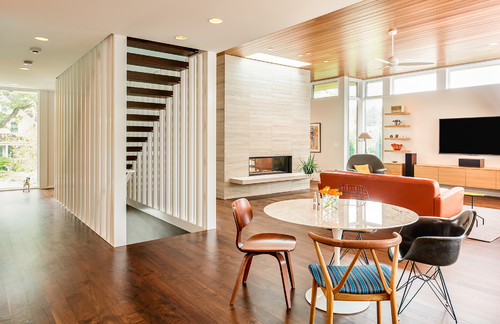 円形のテーブルに、1940~1960年代にデザインされた有名なチェアを4種類コーディネートした例。