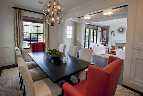 黒い木製長方形テーブルの長手にベージュのファブリックチェア、短手に背もたれが高い赤のファブリックチェアをコーディネートした例。