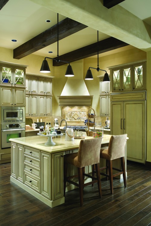 ウォールユニットを上下に2段も取り付けられる天井高のあるゴージャスなキッチン例ですが、シャビーな扉デザインは、一般的なキッチン空間でも参考にできそう。