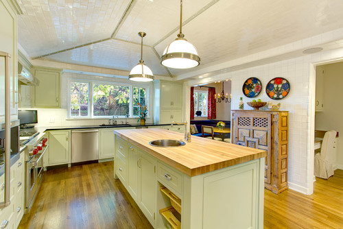 框扉のI型キッチン+木製天板のアイランドキッチンの例。