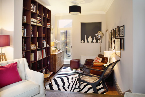 茶色レザーの一人掛けソファ、黒のチェア、黒×ホワイトのアニマルっぽい柄のラグのリビングに、黒のシェードの円柱型ペンダント照明を吊り下げた例。
