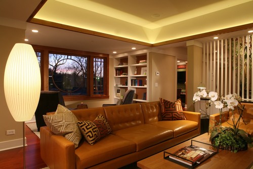 灰みがかった茶系の枠+折り上げ天井+電球色の間接照明の組み合わせ例。