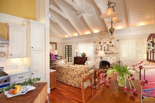 モールディングやマントルピースが可愛いヨーロピアンなリビングに折り上げ天井を作り、ホワイト系の間接照明と組み合わせた例。