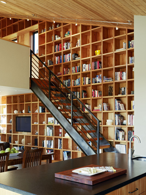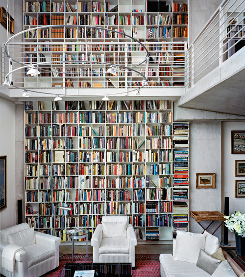 リビングダイニングの壁面に幅10m、高さ3mくらいありそうな本棚を作り、アルミっぽいデザインのはしごを掛けた例。