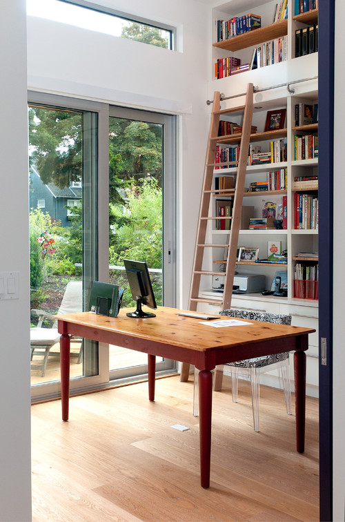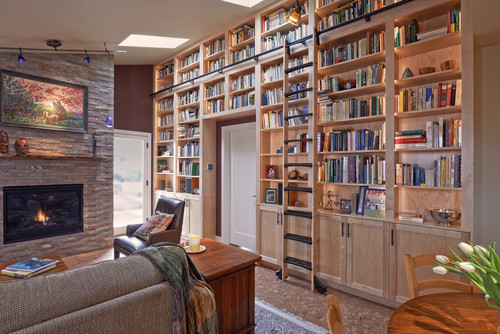 仕事部屋の壁にダークブラウンの床から天井まであるL型の本棚を作り、本棚と同じ色のはしごを立て掛けた例。