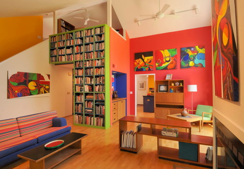 廊下の両サイドに、床から天井&廊下の長さ全部に、真っ赤な本棚を作った例。