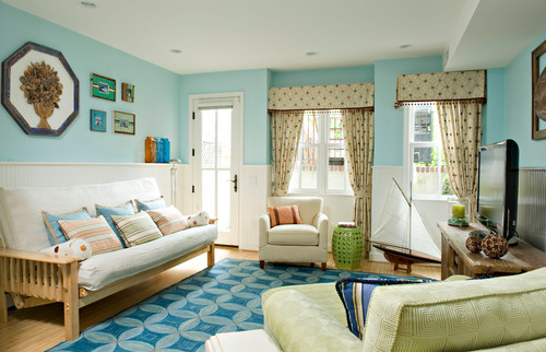 ホワイトの腰壁+水色の壁のリビング例。