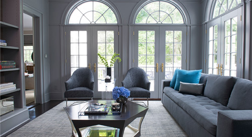 薄いグレーのドアに、丸みを帯びた真鍮製のレバー取っ手をつけた例。