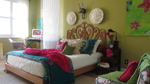 ベッドカバーとヘッドボードに民族柄を使った例です。